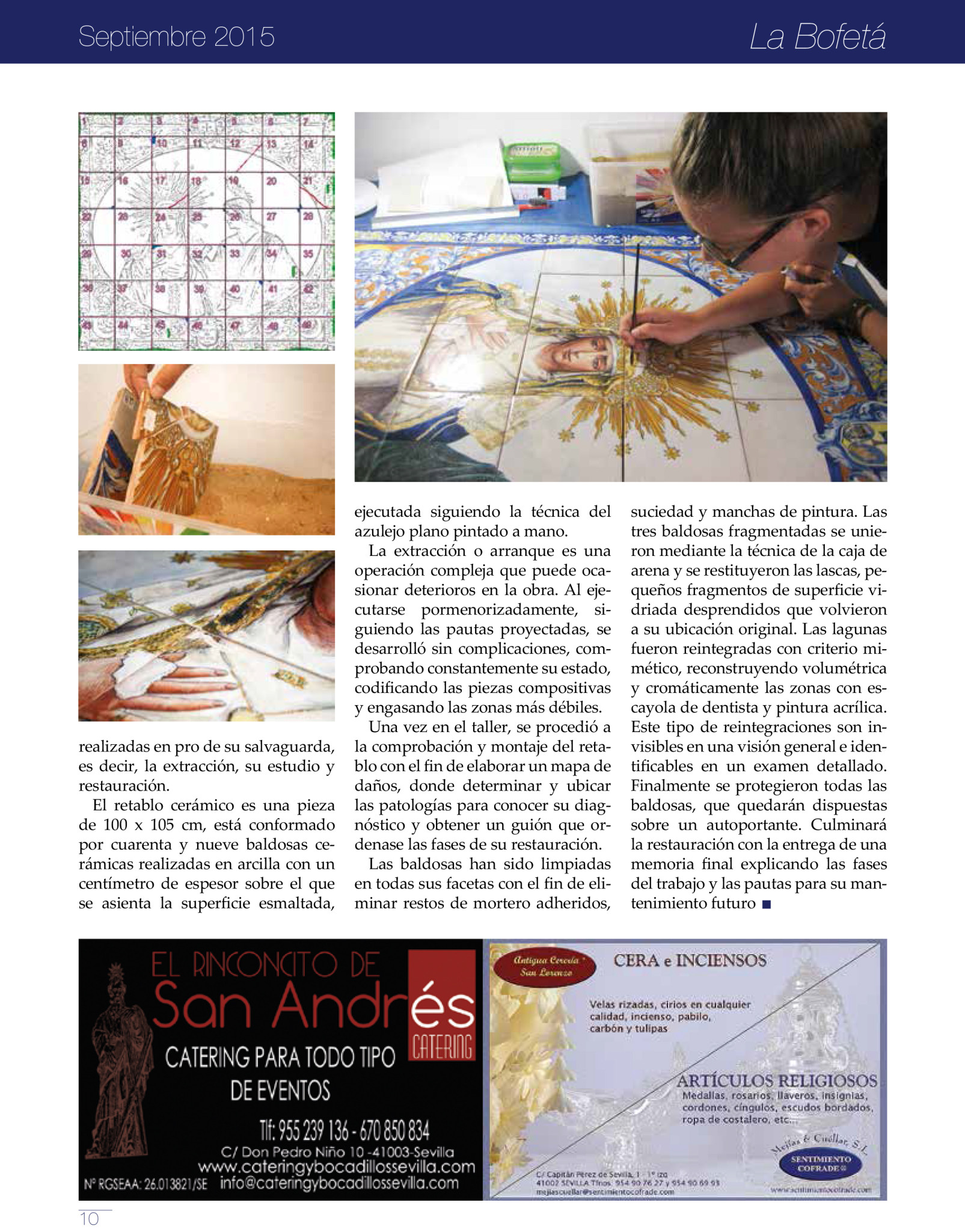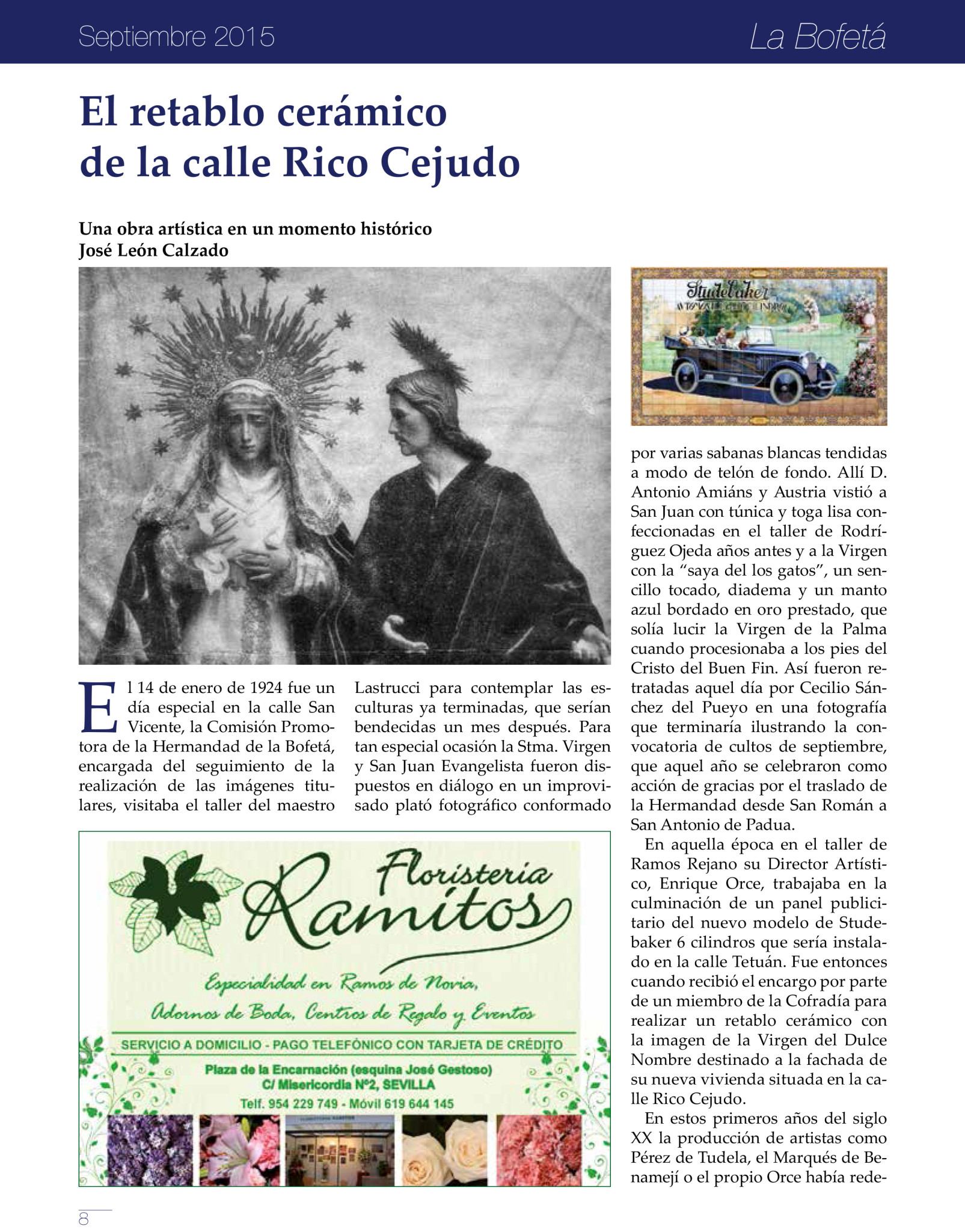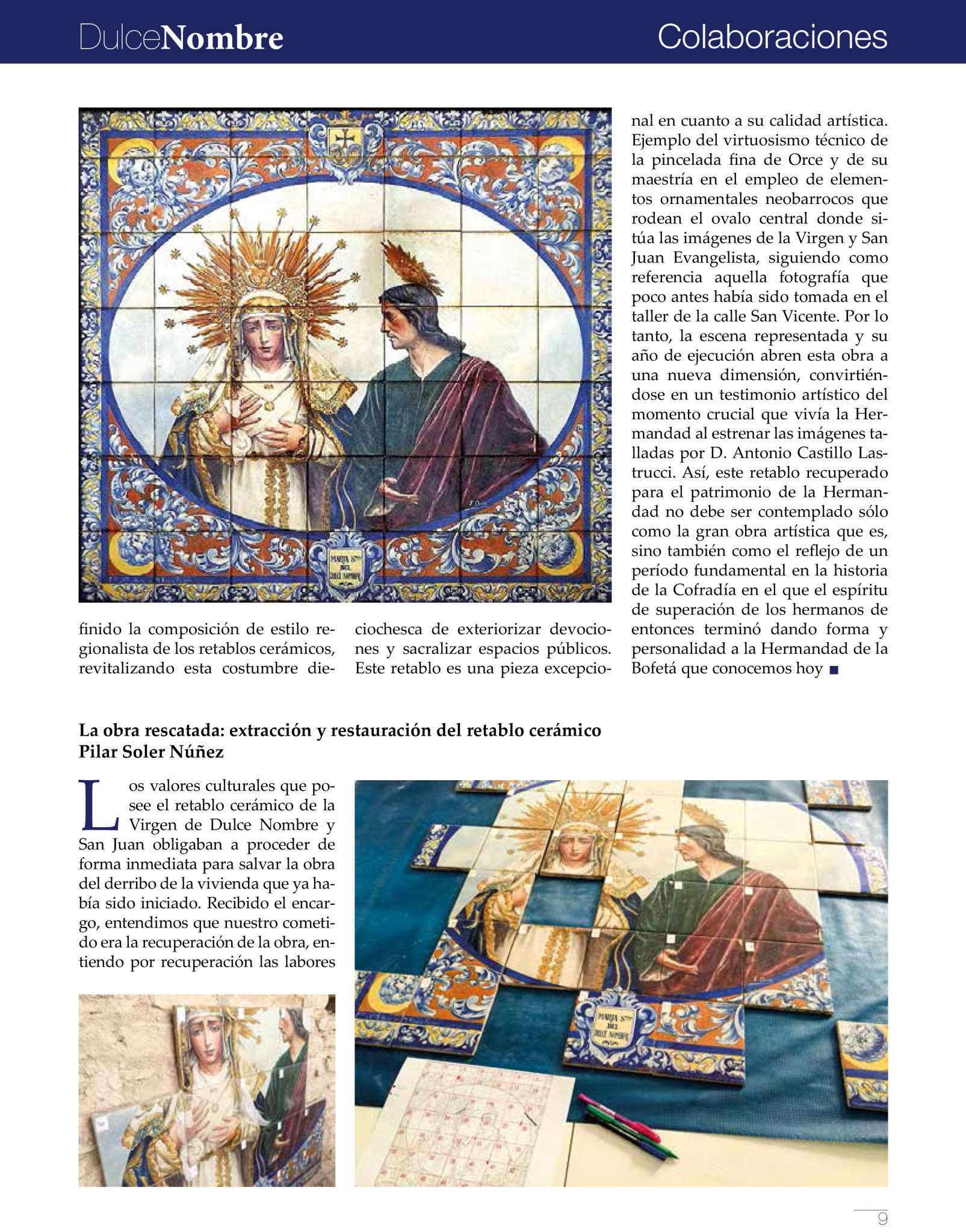 Con motivo de la realización de los trabajos de recuperación del retablo cerámico de María Santísima del Dulce Nombre y San Juan Evangelista, Titulares de la popular Hermandad de la Bofetá, la Junta de Gobierno nos solicitó la colaboración en el número del Boletín "Dulce Nombre", que se publicó en septiembre. Nuestra aportación consistió en un artículo sobre los valores culturales del retablo y el proceso de restauración que estábamos ejecutando.