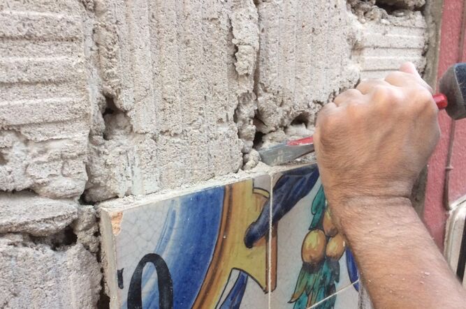 Una vez extraídas, numeradas y clasificadas las baldosas de cada uno de los azulejos, se procederá a la retirada de los depósitos de suciedad superficiales mediante paños, hisopos de algodón y gasas suaves impregnadas de limpiadores no iónicos neutralizados con agua desionizada. Las manchas de pintura y otros depósitos de mayor entidad se retiran con bisturí. La eliminación del material de relleno y de los morteros de agarre del anverso se hará con martillo, cincel y amoladora.