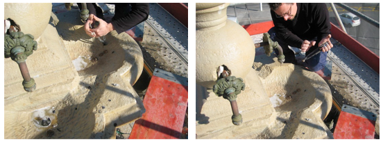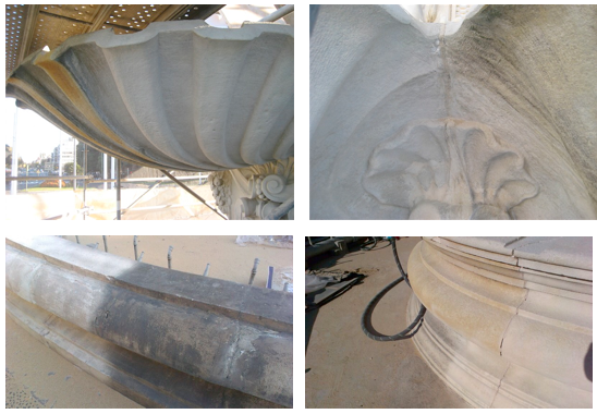 Limpieza química de las figuras alegóricas de las Cuatro Estaciones (segundo cuerpo de la fuente).- Eliminación de líquenes y costras negras producto de la contaminación.