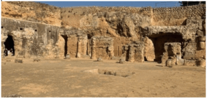 La tumba es un edificio sobresaliente en cuanto a sus características arquitectónicas y pinturas murales. Consta de un atrio de 24 x 17,6 m. que fue excavado en la roca, aprovechando el hueco casi geométrico de explotación de una antigua cantera (Cantera Mayor del Campo de las Canteras) de roca calcarenita (alcoriza), completando su forma mediante excavaciones y construcciones. Este atrio semejaba el patio de una domus y estuvo rodeado de columnas (Abad Casal y Bendala Galán 1975; Ruiz Cecilia et al., 2011; Rodríguez Hidalgo, 2012). En el centro de este atrio se conserva un pequeño impluvium de 2,95 por 1,75 m. que es el objeto de esta actuación.