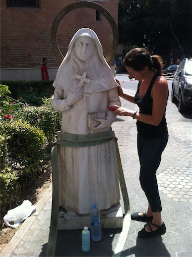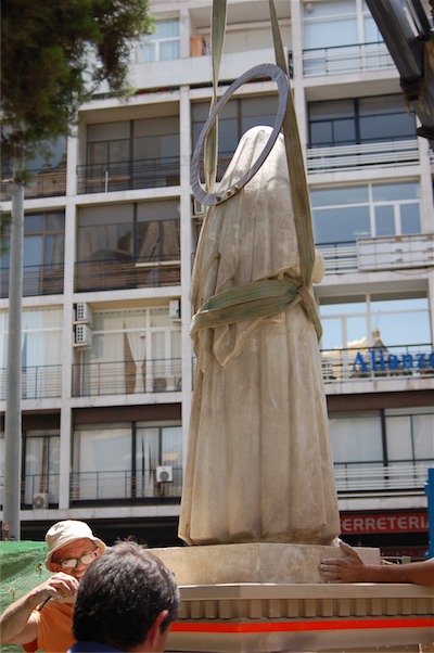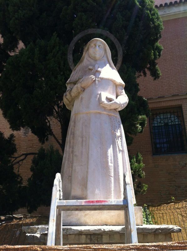 La limpieza de la escultura se realizó in-situ, pero para el resto de la intervención hubo que desmontar el monumento y poner a Santa Ángela a pie de calle.