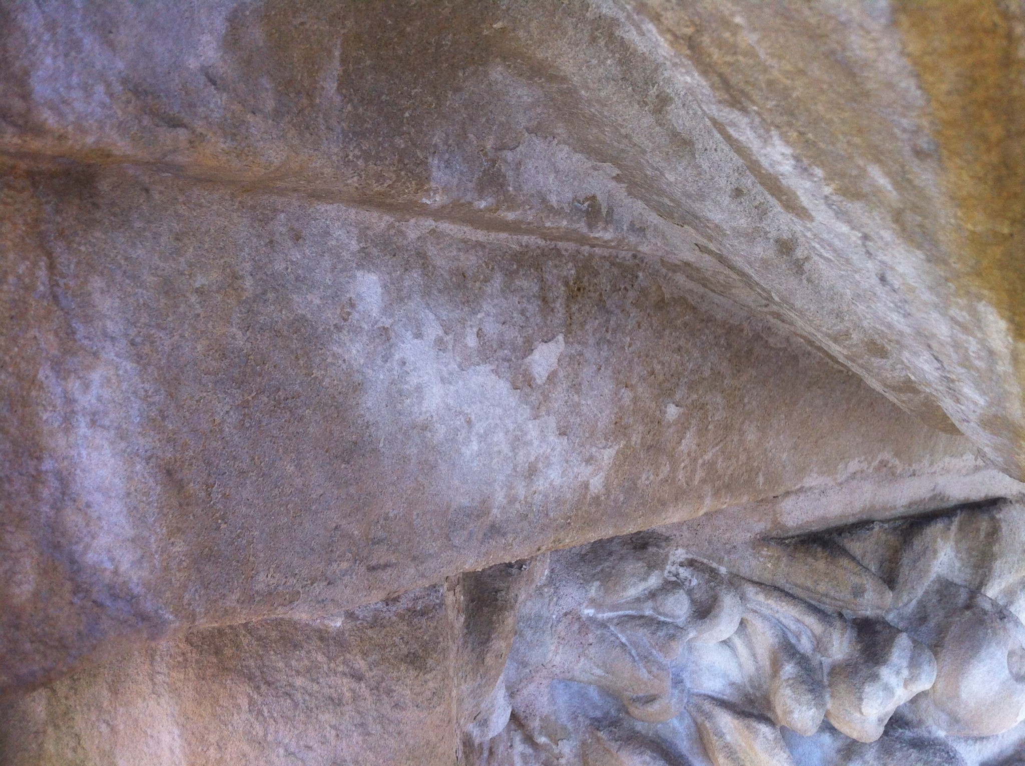 Se han hallado dos inscripciones talladas en la superficie de la Fuente de las Cuatro Estaciones. La primera de ellas prácticamente perdida debido a la erosión es ilegible, adivinándose tan sólo una M y una B, que podrían corresponderse con la firma del escultor. No hay dudas, sin embargo, de la inscripción hallada en el segundo cuerpo de tazas aveneradas, donde sí puede reconocerse la firma del artista.